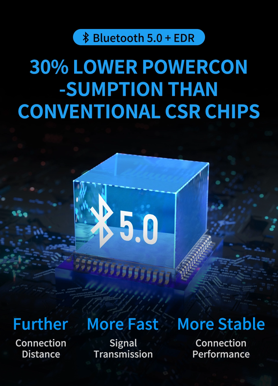 >BLUETOOTH 5.0+EDR & CSR8675 BLUETOOTH CHIPS - 30% lower power consumption than conventional csr chips further connection distance, more fast signal transmission, more stable connection performance. By using advanced manufacturing technology, the area of finished products is reduces by 20% compared with csr8645, which contains more electronic components in a limited volume.