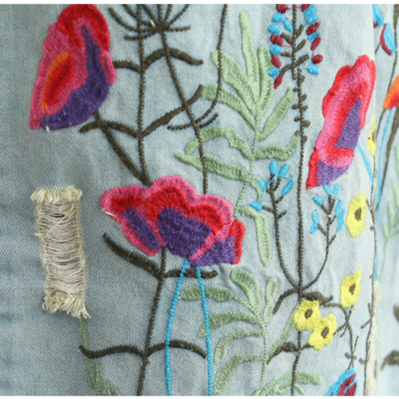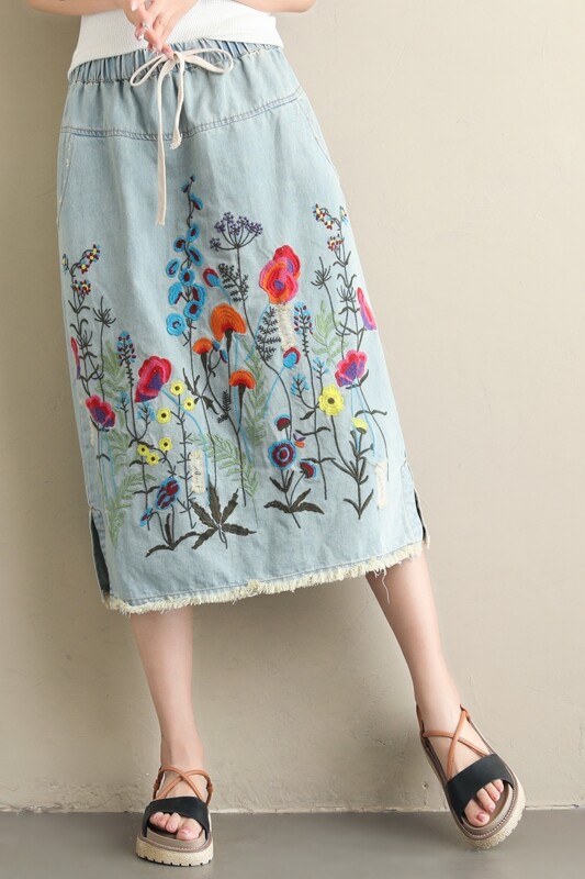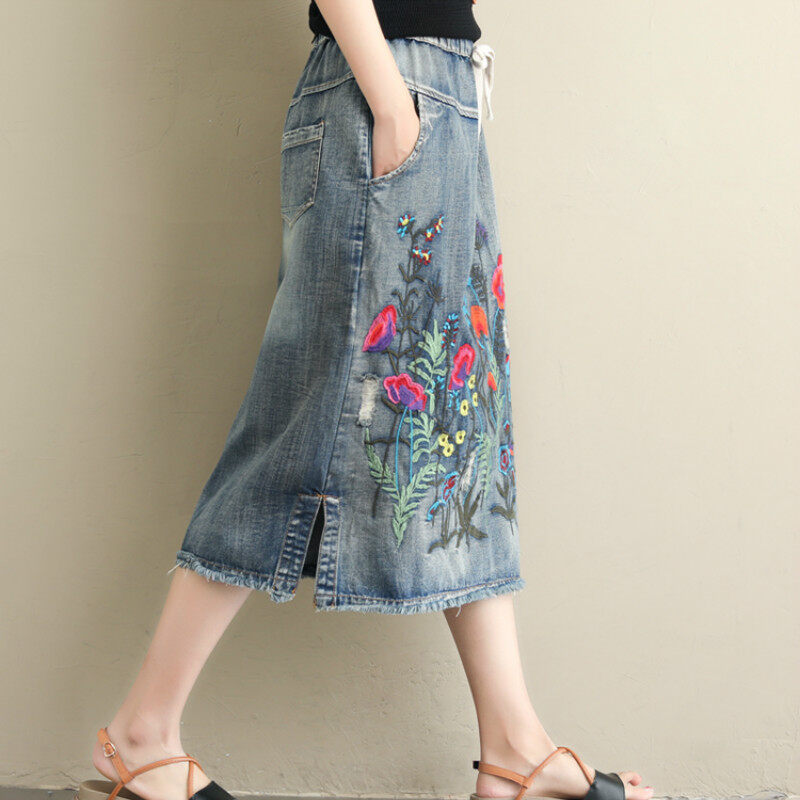 Drawstring Waist Summer Elastic Waist Floral Embroidered H-Line Retro Long Denim Skirts for Women L XXL