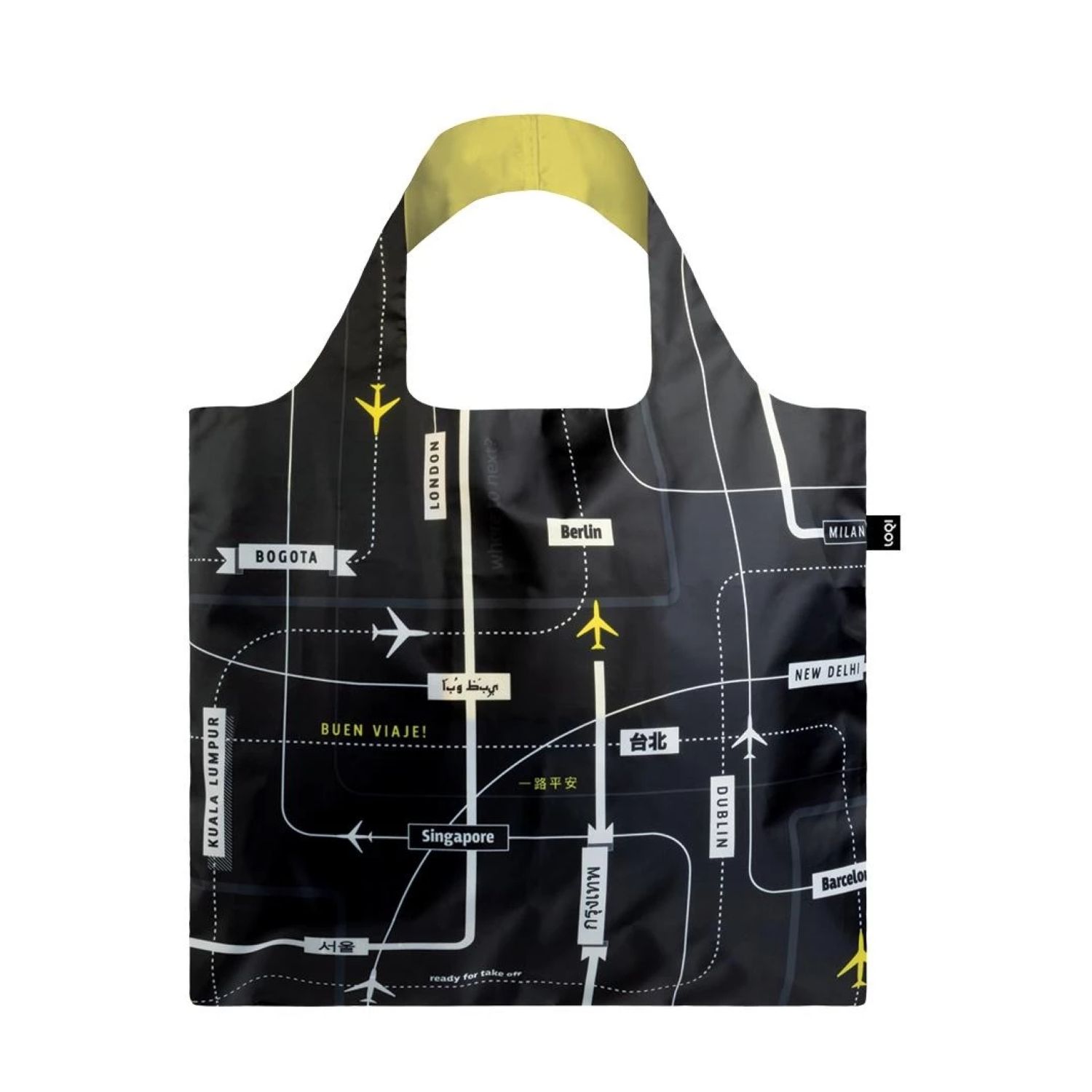 An array of airplanes already airborne. A final call for a flight to Vancouver. Beijing is just beginning to board. From New York to Berlin. Rome to Beijing. Where are we going next? Simply choose your destination and off we go. It's up, up and away with the Airport tote bag!
