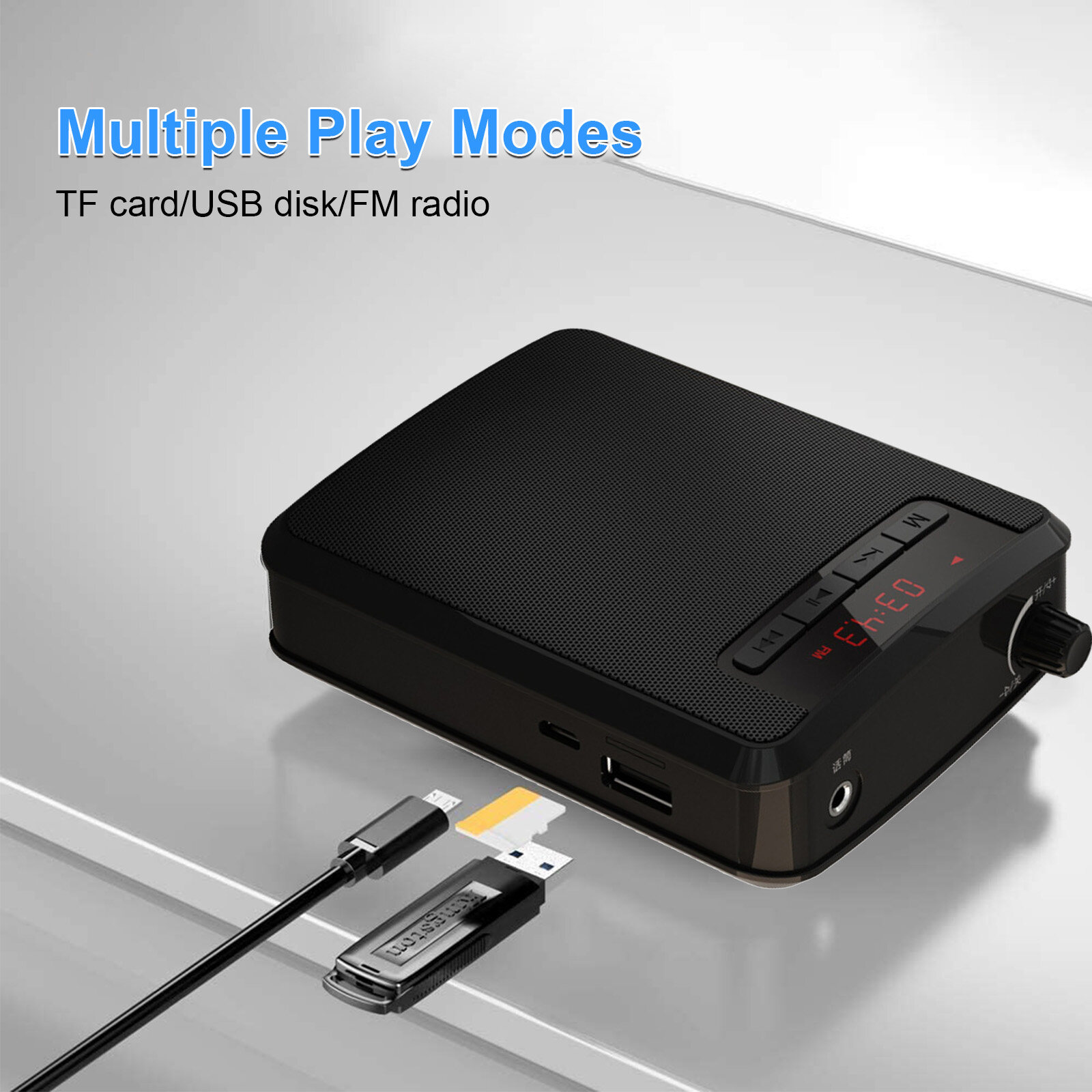 This is a rechargeable mini voice amplifier for teachers, training, coaches, tour guides and presentations, etc. Equipped with wired microphone headset and belt, it is portable and easy to use.