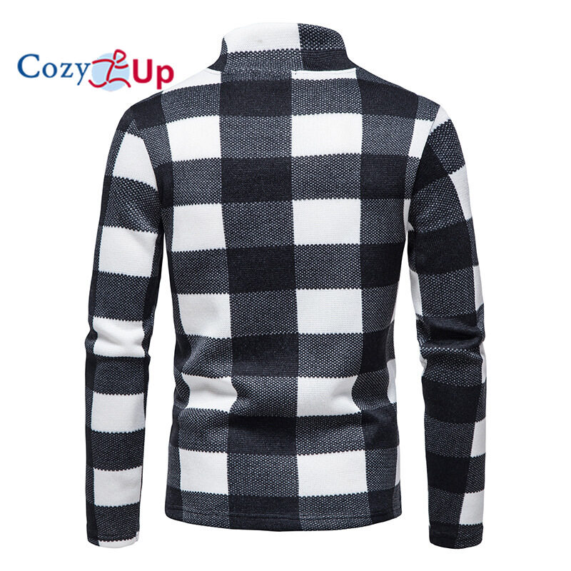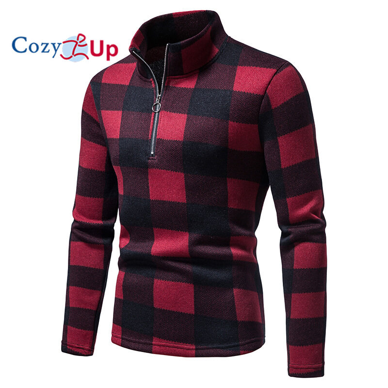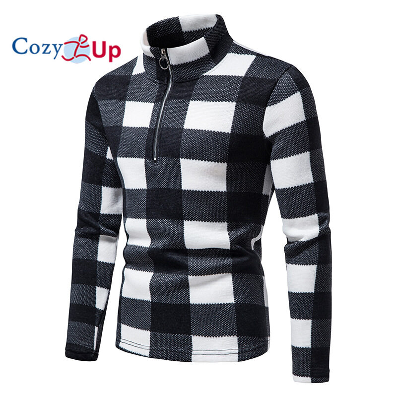 Cozy Up Men Sweater Fashion Zipper Decoration Plaid Batik Casual Stand Collar Pullover