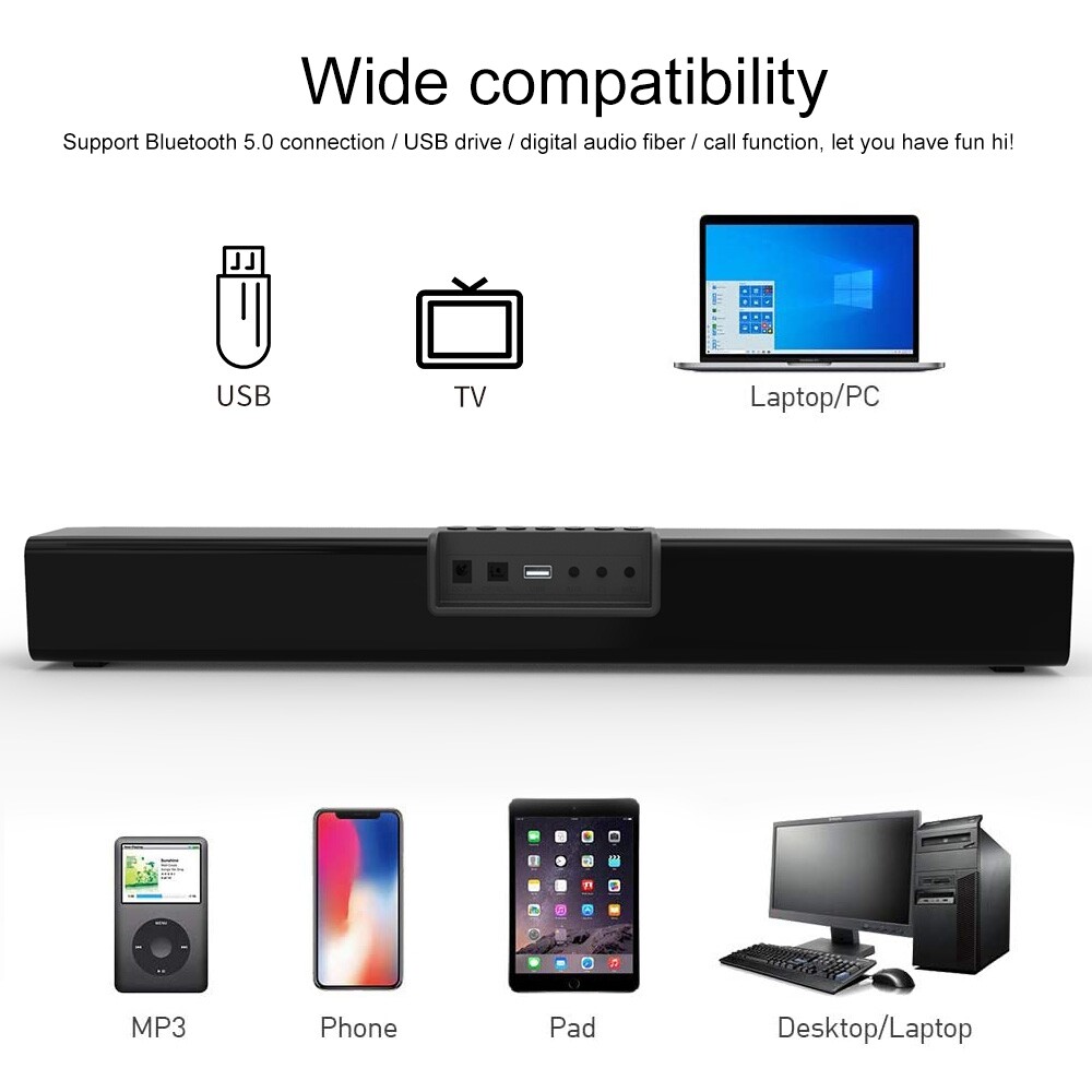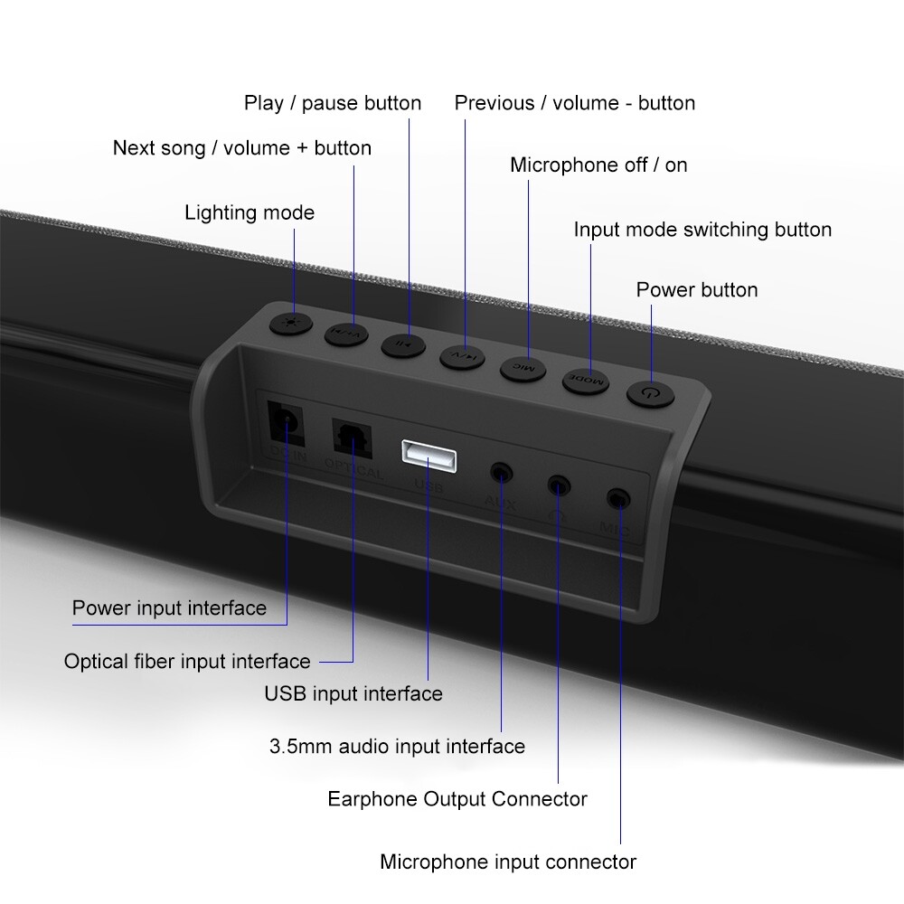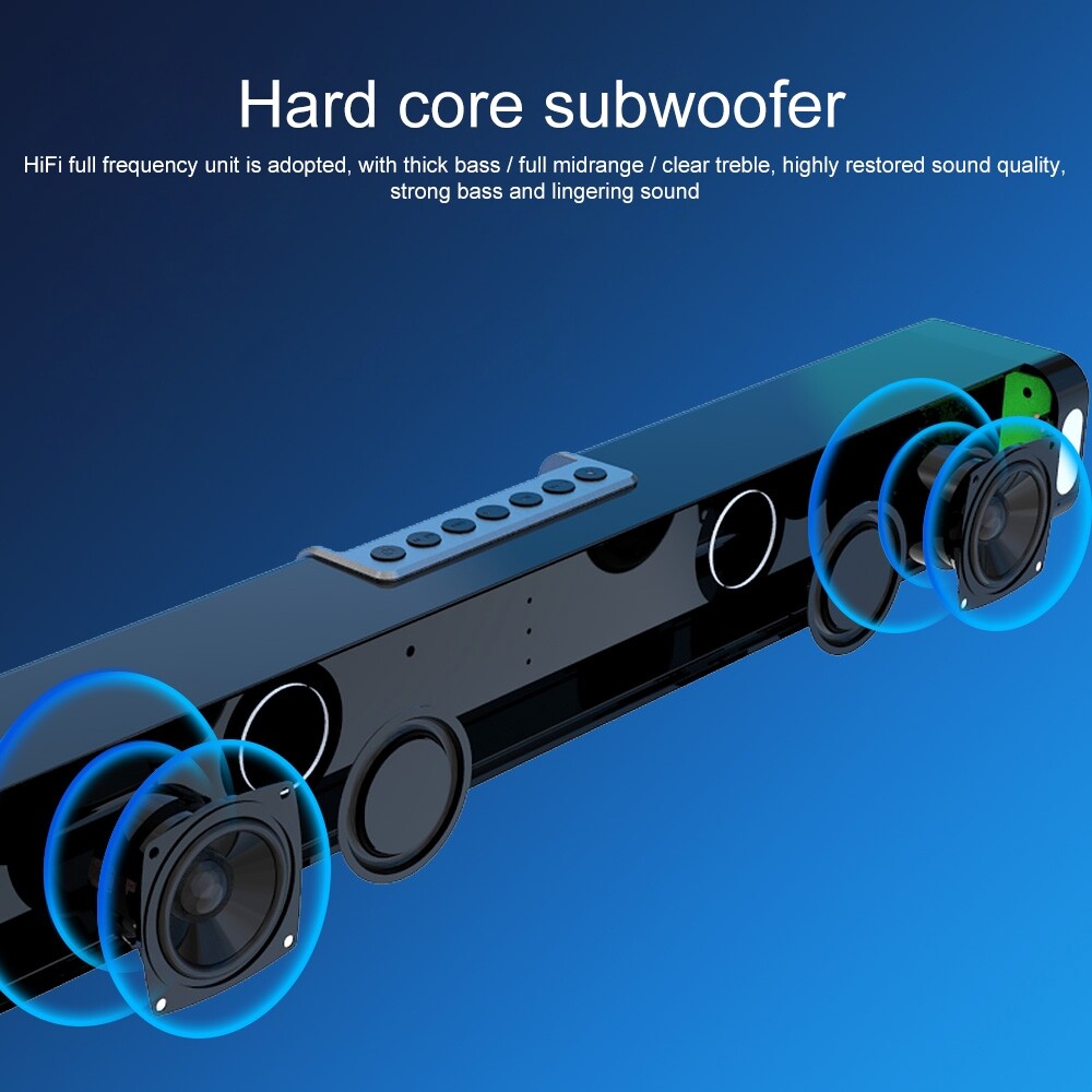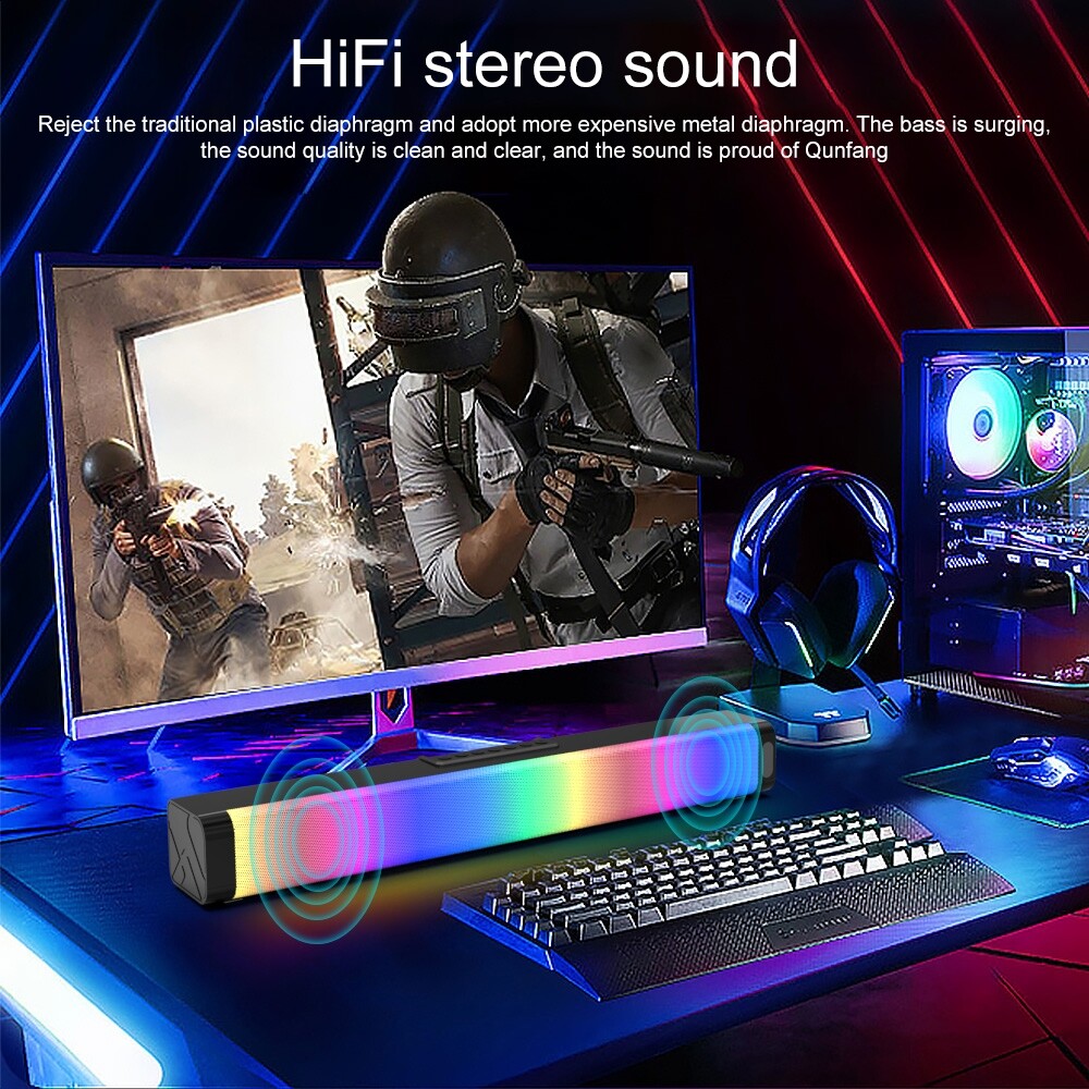 Features:1. Simple design2. Double speaker unit, 20W high power, large volume, plenty of power, surging and powerful3. Support Bluetooth 5.0 connection, support U disk, 3.5 audio, optical fiber and other connection methods4. Support call function, fully realize online voice networking, so that your network communication is unimpeded5. Colorful spectrum lighting effects make your speakers no longer monotonous, and 5 lighting effects will bring you a deeper sense of surround immersionProduct specifications:1. Bluetooth chip: Zhongke Nanxun2. Bluetooth version: V5.0; Bluetooth protocol: RF.5.0.13. Power amplifier: Zhipuxin CS86734. Material: PVC high gloss5. Speaker power: 20W6. Speaker impedance: 4 ohms7. Power supply voltage: DC 12V/2A8. Frequency response: 120Hz-16KHz9. Signal to noise ratio: greater than or equal to 65dB10. Light mode: horse racing to the right, horse racing to the left, rhythm, breathing, flashing11. Lamp bead power: 5W12. Number of lamp beads: 3013. Digital audio bit rate: 32K-192K14. Product size: 50x7.5x6.2cm15. Net weight: 0.75kg