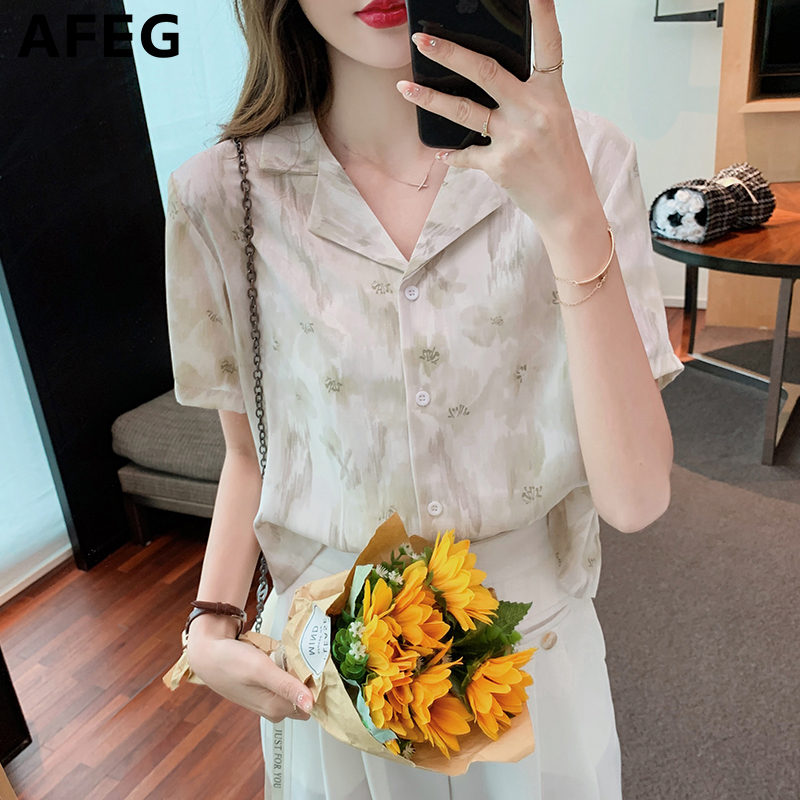 AFEG Korean Style Fashion Loose Versatile Retro Print Chiffon Short Sleeve Blouse for women