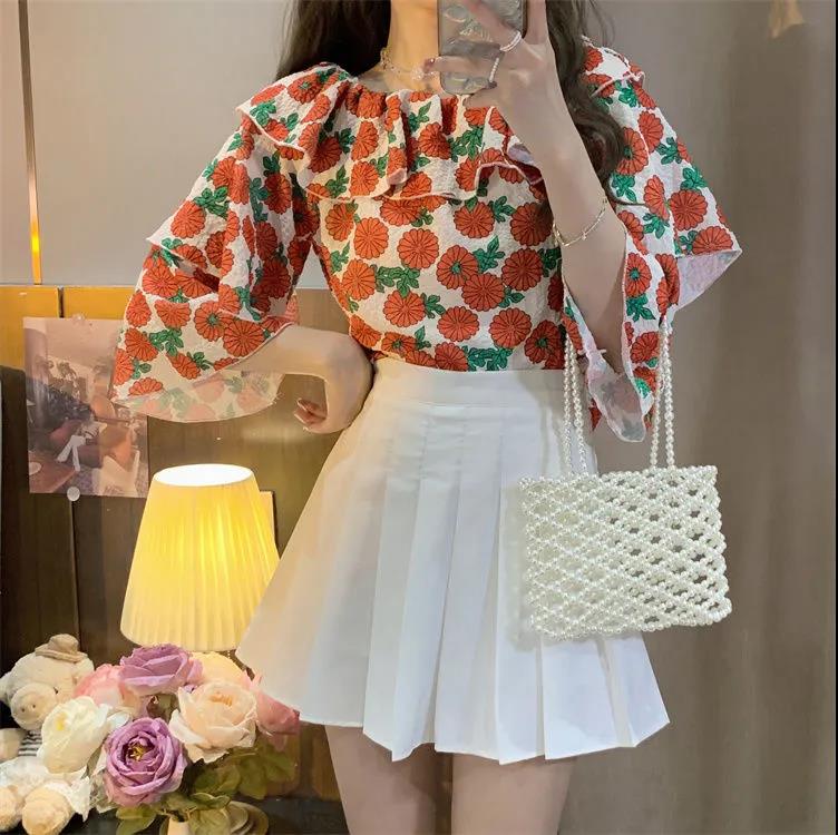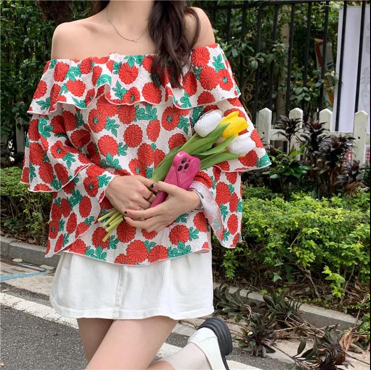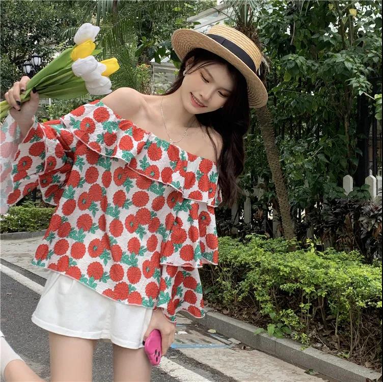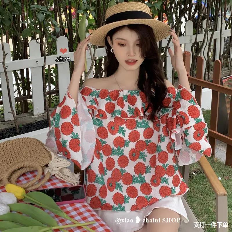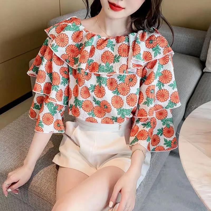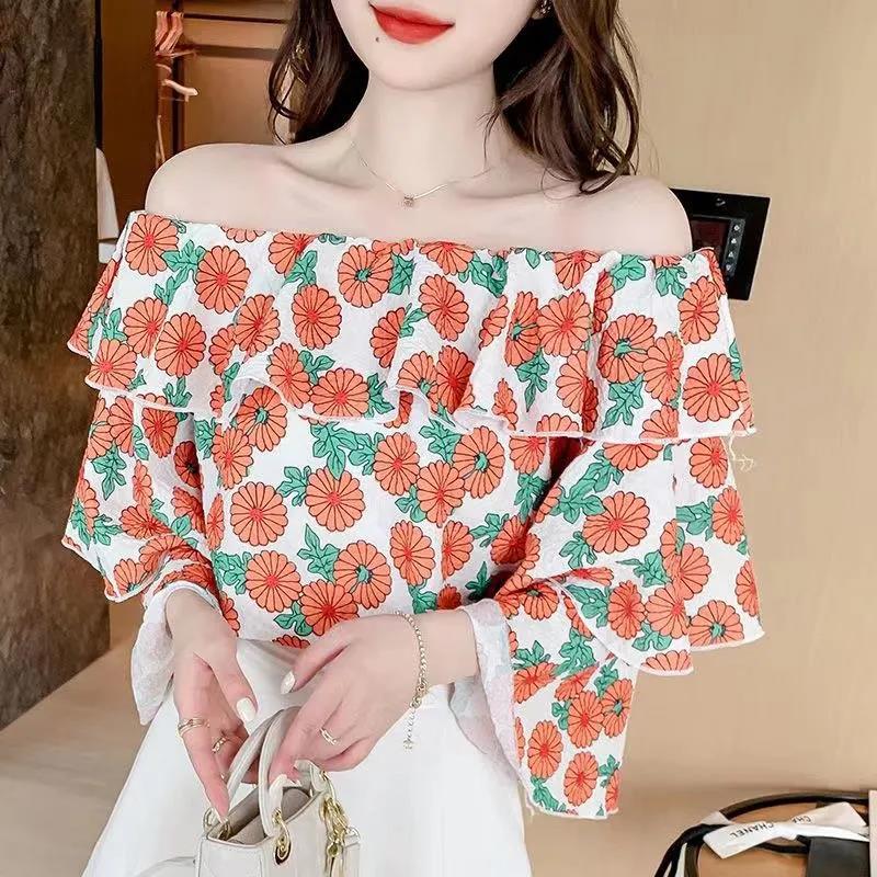 EDQRDQ Women's Casual Off Shoulder Floral Printed Ruffle Tops 3/4 Sleeve T Shirts Loose Summer Blouses Shirt