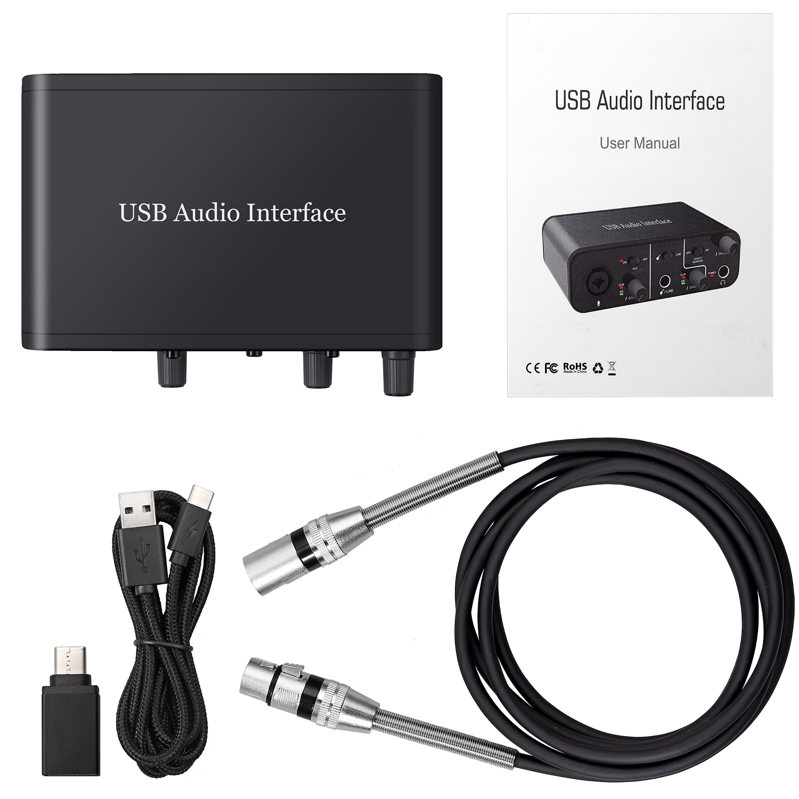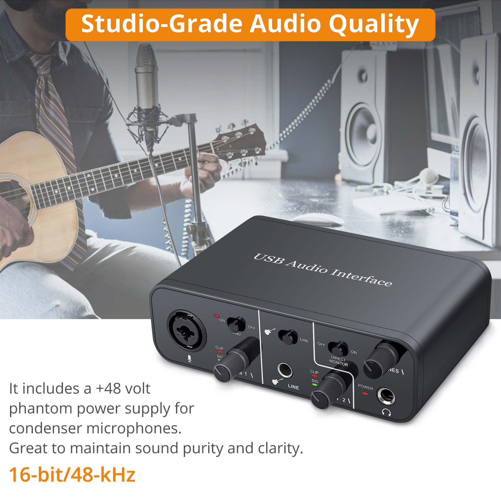 1. The USB external sound card has all connection interfaces such as microphone, electric guitar, bass, etc. This includes +48V phantom power for condenser microphones, delivering studio-quality audio up to 16-bit/48kHz, maintaining sound purity and clarity. Whether you're a busy singer, songwriter, producer, or just need company during the recording process, this USB external sound card will help you shine in the digital realm.