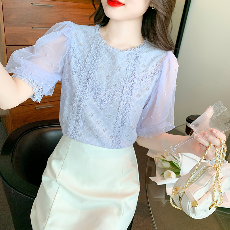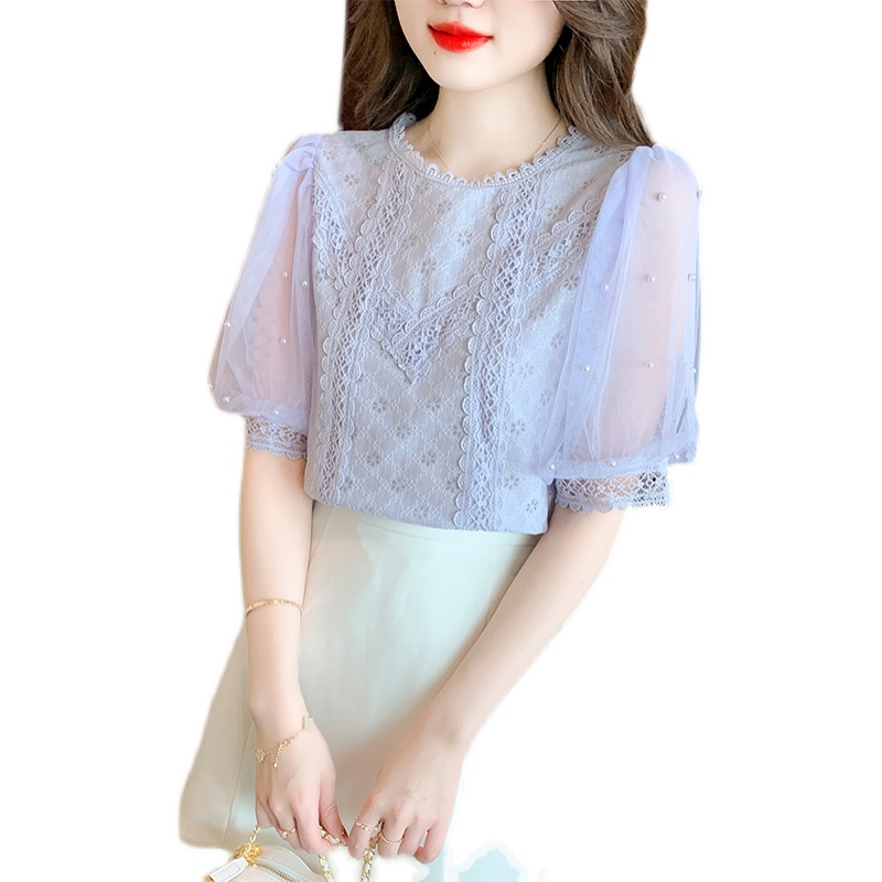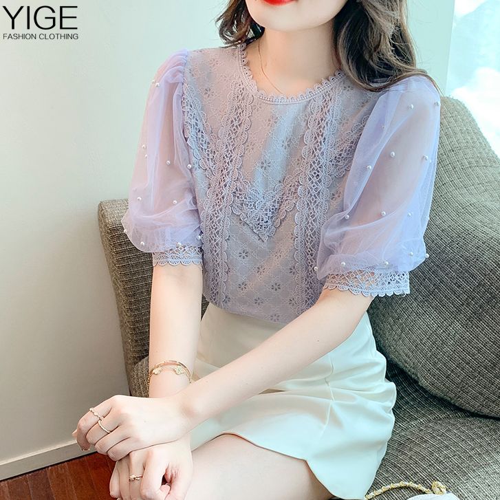 YIGE Round neck beaded lantern sleeves fashion lace blouse 2022 summer new Korean version tunic top