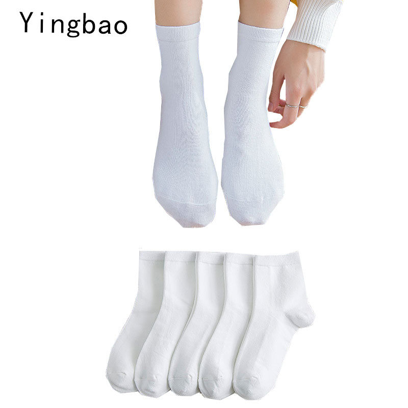 Yingbao 5 pair Womens Cotton Socks High Ankle Casual Sock for Ladies Solid Color Black Grey White