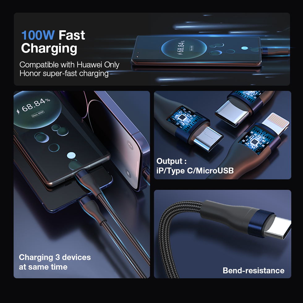 - Triple Simultaneous Charging Cable (Micro USB, iP and Type-C)