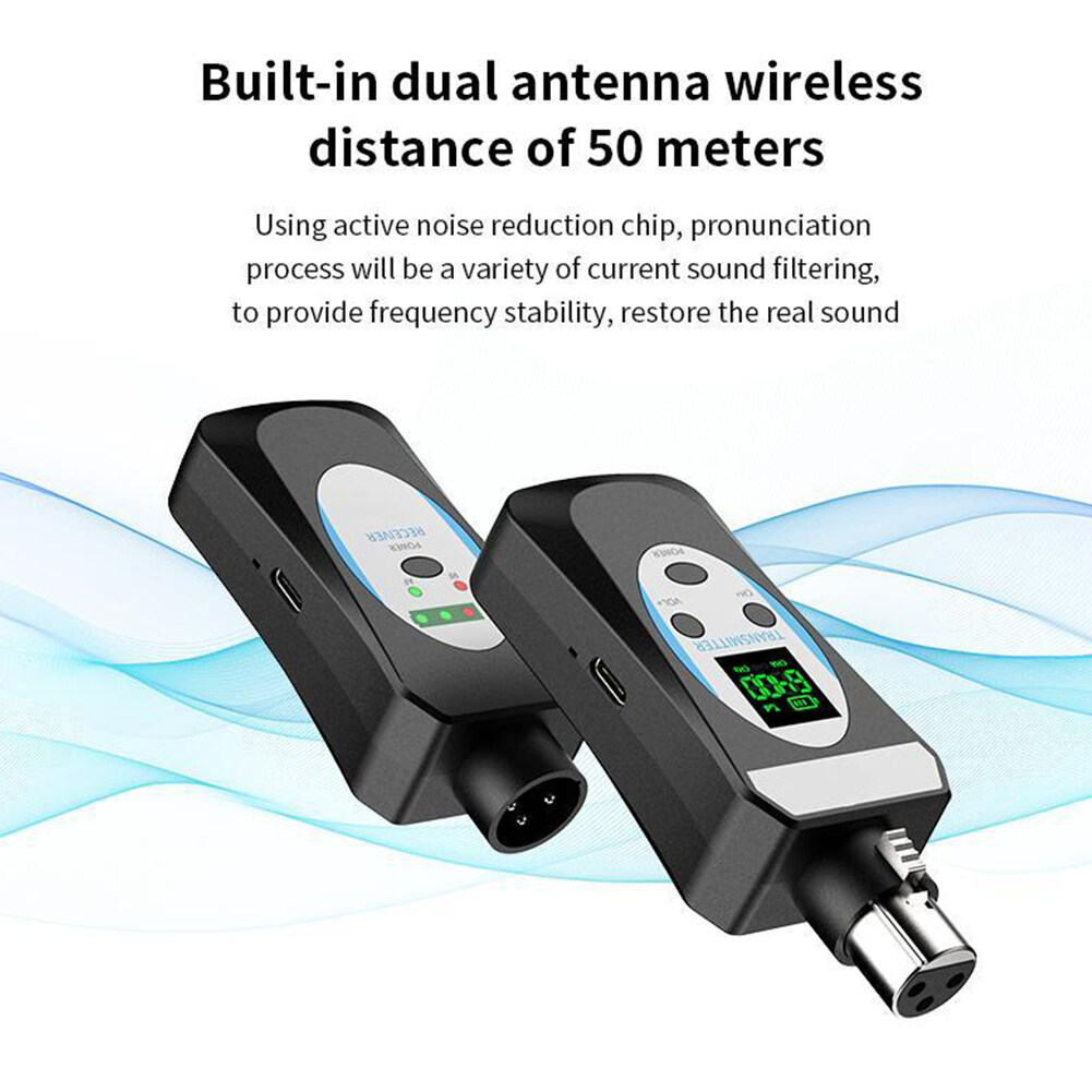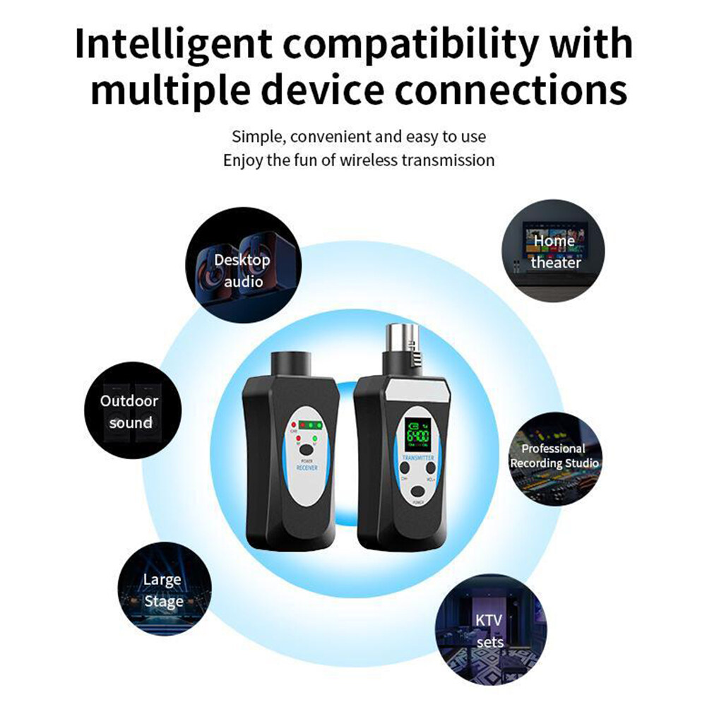 Feature: 1. Advantages and Scenarios: The microphone wireless transceiver solves the wireless audio signal transmission between the microphone and the audio, the mixer, and the sound card, realizing the expansion effect of wireless audio transmission, and solving the traditional wiring mode. This product is suitable for stage performances, outdoor entertainment, speeches, outdoor performances, and other places