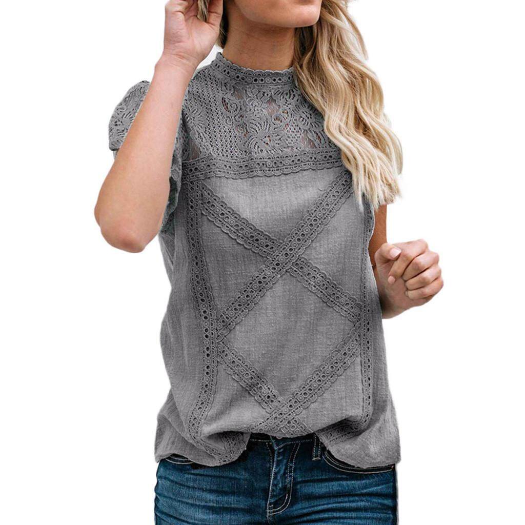 Womens Lace Patchwork Flare Ruffles Short Sleeve Cute Cotton Shirt Blouse Top