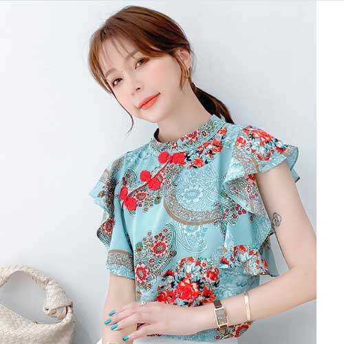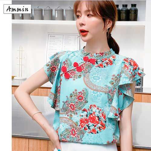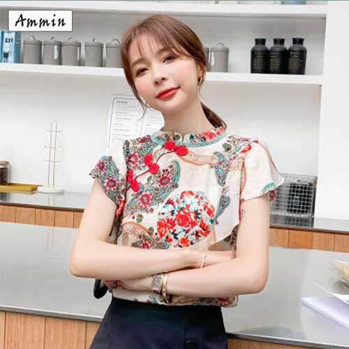 AMMIN summer new chiffon floral top female flying sleeves retro disc buckle ruffled shirt blouse