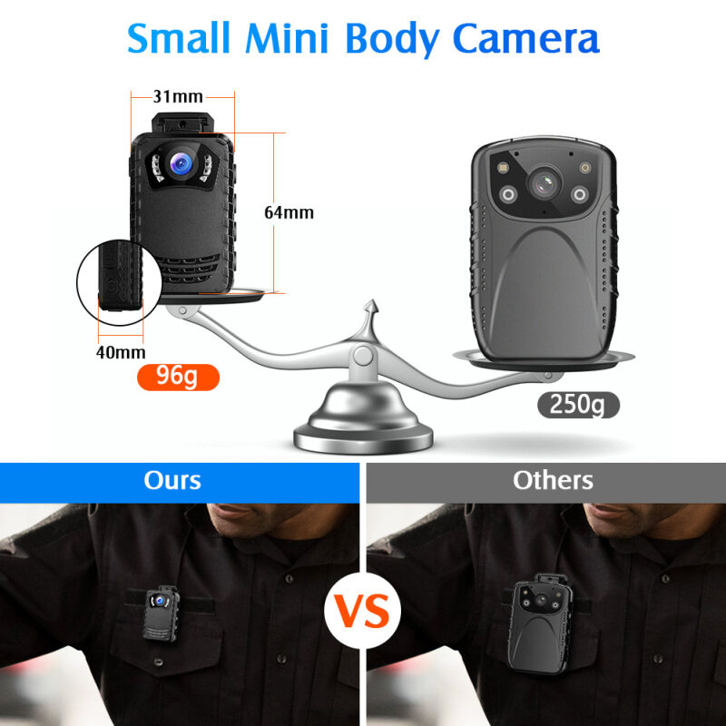 ★【Smallest Body Camera, Compact and Portable】★N9 Body mounted camera features compact size and lightweight, 80g only and 68mm×43mm×34mm dimensions. Although it is a smallest body camera in all body camera models, but still has complete features and functions. Support Edit Police ID ,File Protection Function ,Stealth Mode, Playback video, Delete Files from the camera directly, Motion Detection ect.